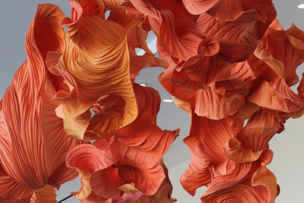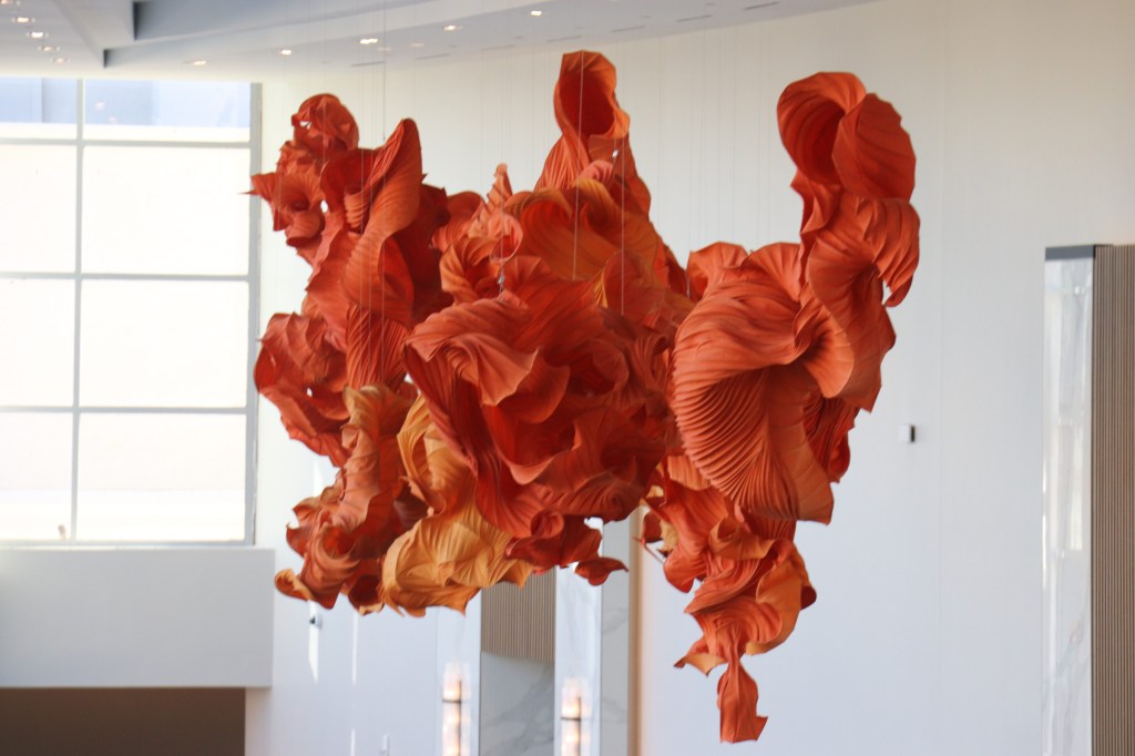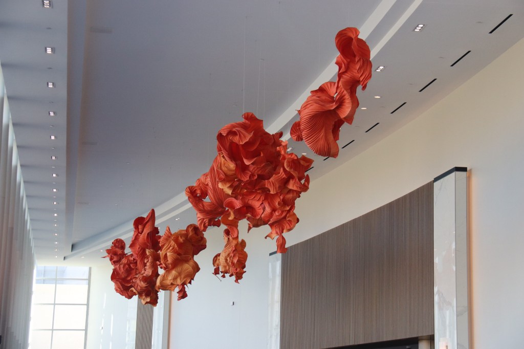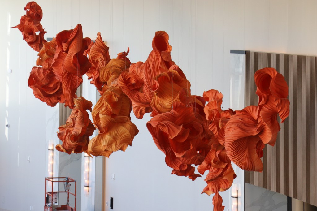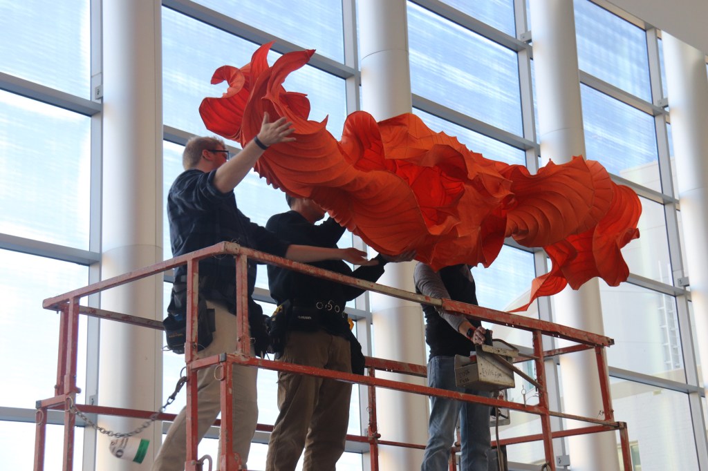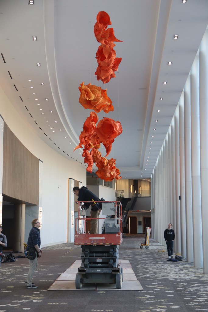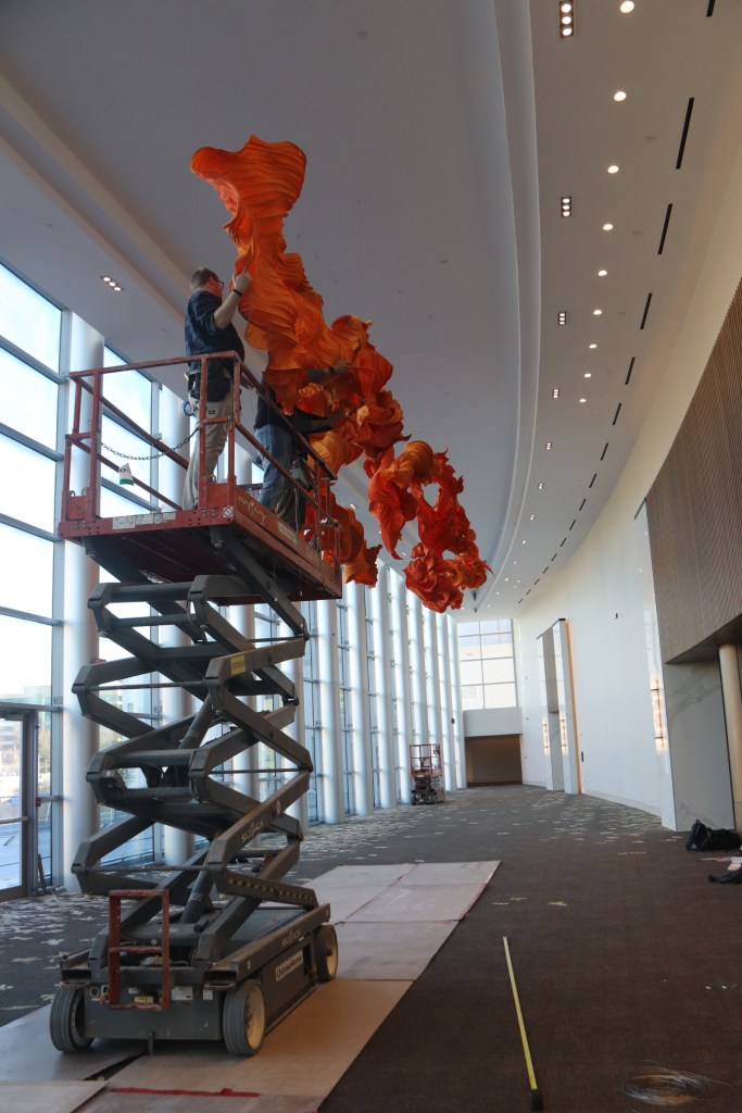 Here are some behind the scenes pictures of the installation of Peter Gentenaar latest creation, Orange Jazz, in the Gas South Arena in Atlanta.
