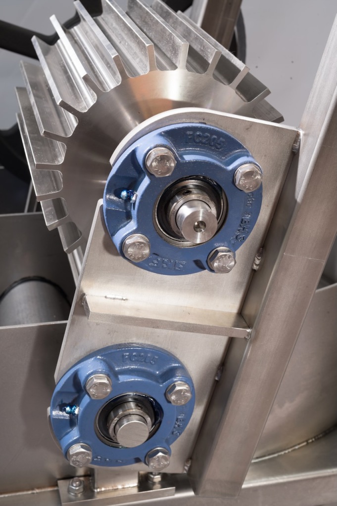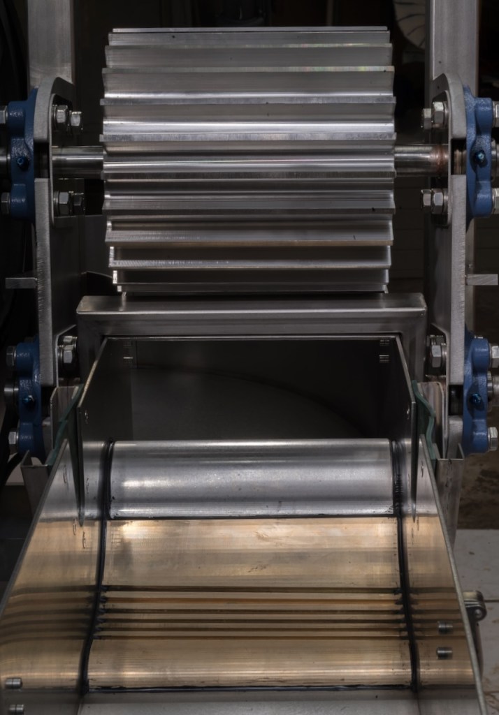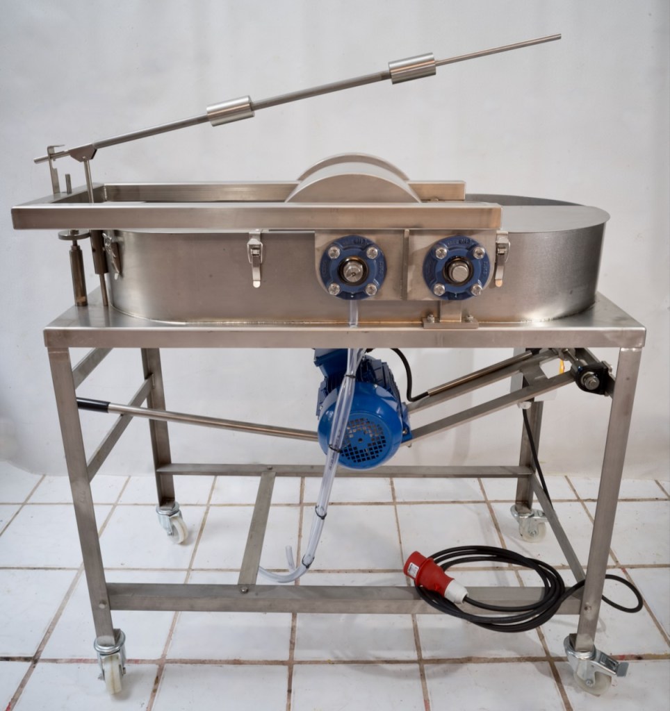 A machine suitable for beating long fibers, flax, hemp or sisal, as well as for beating soft and short fibers like cotton linters. The machine is built in stainless steel and has a bronze bedplate. The bronze bedplate has the same curve as the knife roll, this gives effective grinding/beating over a surface of: ± 20 x 10 cm. The distance between the roll and the bedplate can be finely adjusted. Also the weight under which the fibers are beaten can be varied from 0 to 60 kilo’s. This means you can use the beater on very delicate fibers and on very strong and rough fibers as well.